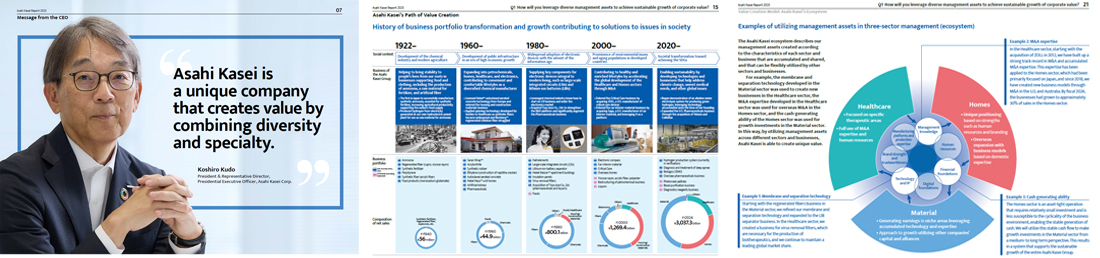 In Asahi Kasei Report 2024 published last fiscal year, we aimed to narrow the gap between the value of Asahi Kasei as we see it and the value perceived in the capital markets. To this end, the report was structured around six actual questions frequently raised by our stakeholders, primarily investors. We received a wide range of feedback, which has been valuable for our efforts to enhance corporate value, particularly in developing our new medium-term management plan, “Trailblaze Together,” for the period of fiscal 2025–2027.