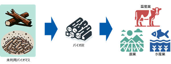 本事業は、宮崎県で発生する流木などの未利用バイオマスに加え、工場から排出される未利用バイオマス等を原料としてHATSUTORIらが開発した炭化技術を使用してバイオ炭を製造し、農業・畜産業の資材として有効活用するサーキュラーエコノミーの構築を目指すものです。また、バイオ炭の農地施用は炭素吸収技術(ネガティブエミッション)の一つであり、カーボンニュートラルに向けた温室効果ガス削減に貢献するものと期待されています。