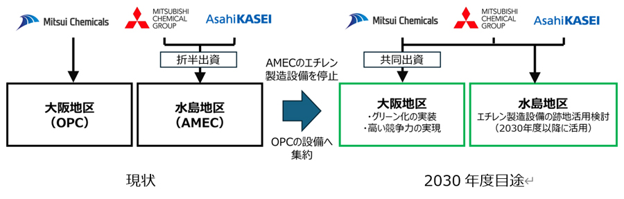 これを受けて、3社は西日本に各社が保有する全2基のエチレン製造設備について、新たに3社で共同事業体を設立の上、2030年度を目途に三菱ケミカル旭化成エチレン株式会社(以下、AMEC)水島工場のエチレン製造設備(所在地:岡山県倉敷市)を停止し、大阪石油化学株式会社(以下、OPC)の設備(所在地:大阪府高石市)へ集約することで合意し、基本契約を締結いたしました。