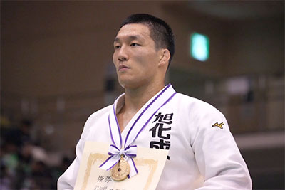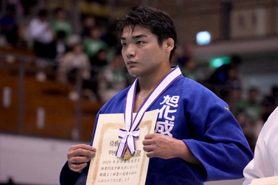 大会2日目、90kg級の岡田陸は、初戦を相手の欠場による不戦勝で勝ち上がると、準決勝は小畑選手(ひらまつ病院)と対戦。勢いのある相手の組み手に苦しみながらも、得意の担ぎ技を軸に攻め続けました。指導2-0とリードしてGSに突入すると、一本背負投による一本勝ちで決勝に進出しました。決勝は、これまで何度も対戦経験のある同級生・徳持選手(京葉ガス)との一戦。序盤から終始岡田のペースで試合を進め、試合開始7分45秒、攻め続けた結果、相手に3つ目の「指導」が与えられ、優勝が決まりました。