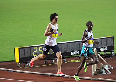 男子10000m第2組に井川、片川が出場。井川は4番手、片川は集団後方に位置取りレースを進めました。3000mを8分24秒で通過した後、ペースが2分53秒/kmまで落ちて、5000mを14分12秒で通過しました。それまで日本人1位の位置でレースを進めていた井川でしたが、8000mを通過した後に1周(400m)65秒までペースが上がり、じわじわと離されて15位28分26秒33でゴール。片川は5000m過ぎに離されて、ペースを戻すことができず、23位29分59秒30でゴールしました。
