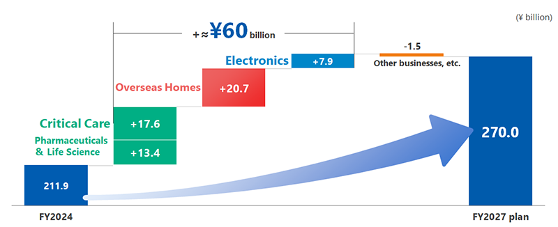 Under the MTP, Asahi Kasei is targeting operating income of ¥270 billion in fiscal 2027. Approximately ¥60 billion of this increase is expected to come from the four First Priority businesses.