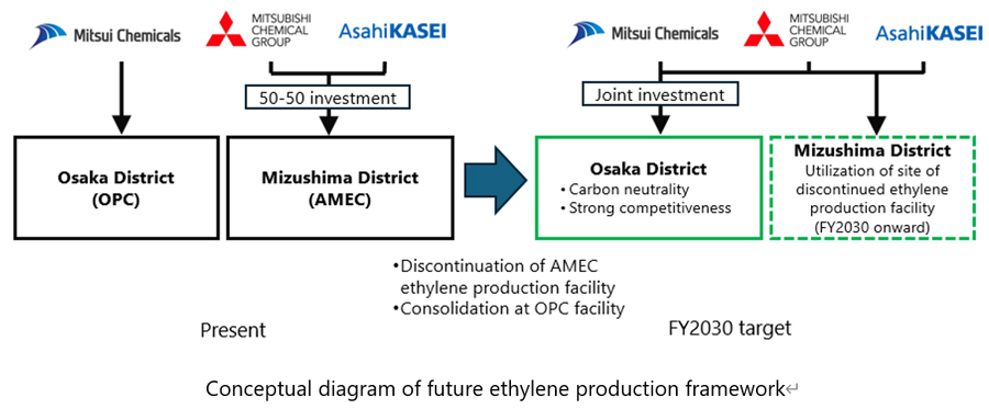 The three companies have signed a basic agreement to establish a new joint operating entity for the two ethylene production facilities in western Japan, and to subsequently discontinue operations of the Asahi Kasei Mitsubishi Chemical Ethylene Corp. (AMEC) ethylene production facility of its Mizushima Plant in Kurashiki, Okayama Prefecture, and consolidate operations at the Osaka Petrochemical Industries, Ltd. (OPC) facility in Takaishi, Osaka, targeting fiscal 2030.